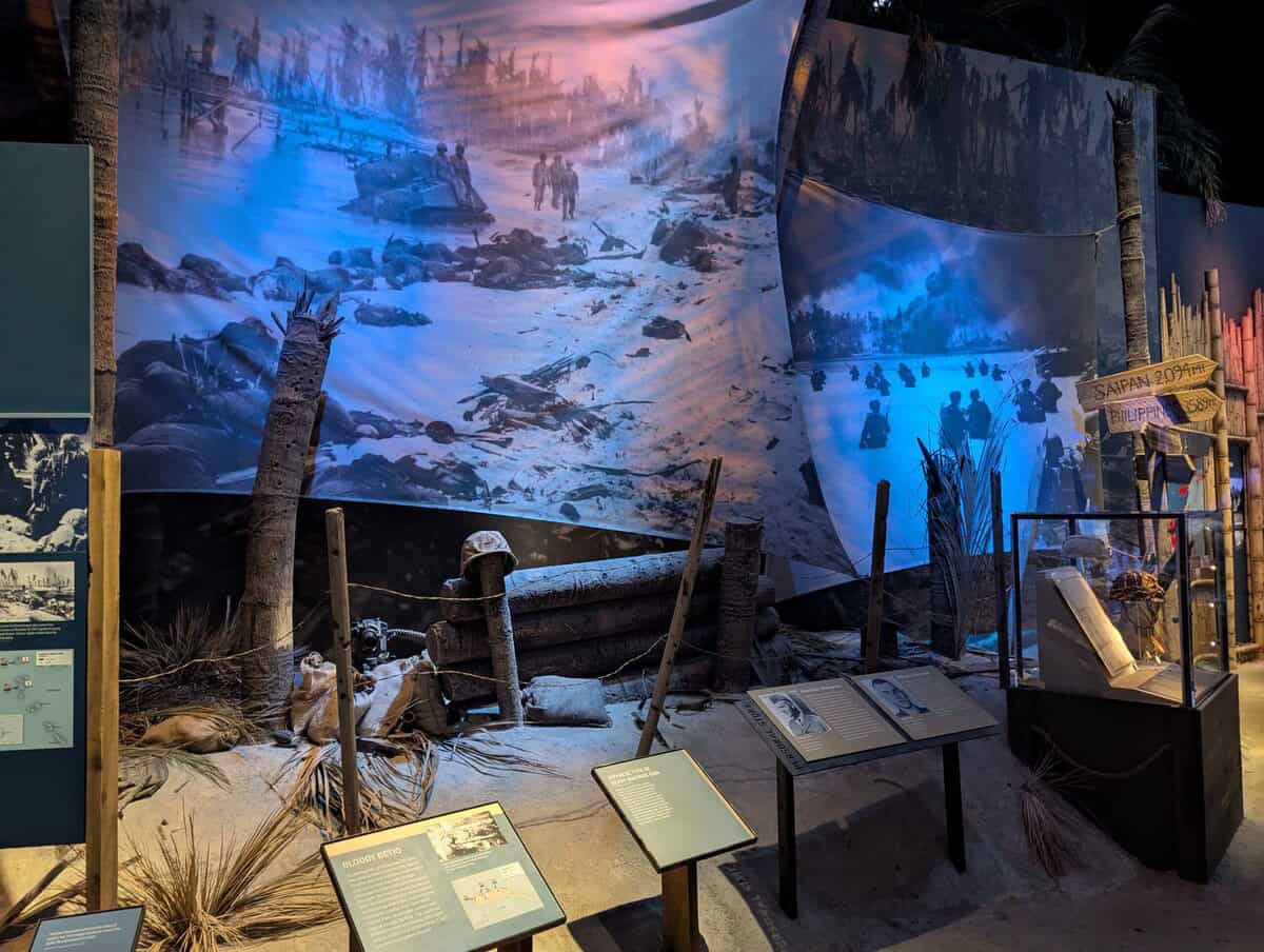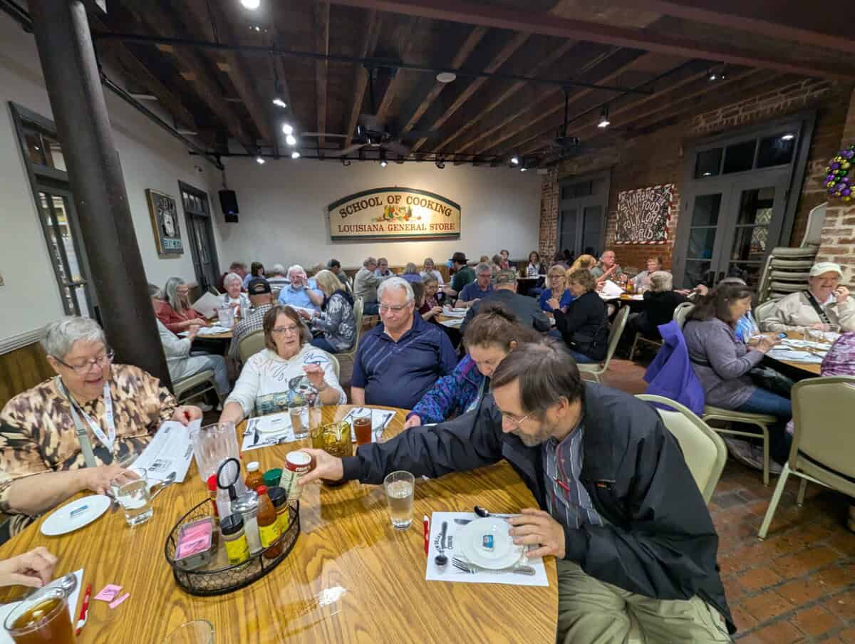 Another sunny day reaching the 70’s. This morning we stopped at the Louisiana Welcome Center on our way to New Orleans. In New Orleans we went to the river and had lunch in the mall along side the Mississippi River. The World War Two museum was next. A huge complex, it had everything imaginable related to the war. After hotel check in, we went to the French Quarter for an evening at the New Orleans Cooking School. Authentic Cajun food was prepared and served with corn & crab soup, jambalaya, flaming bananas foster and pralines.